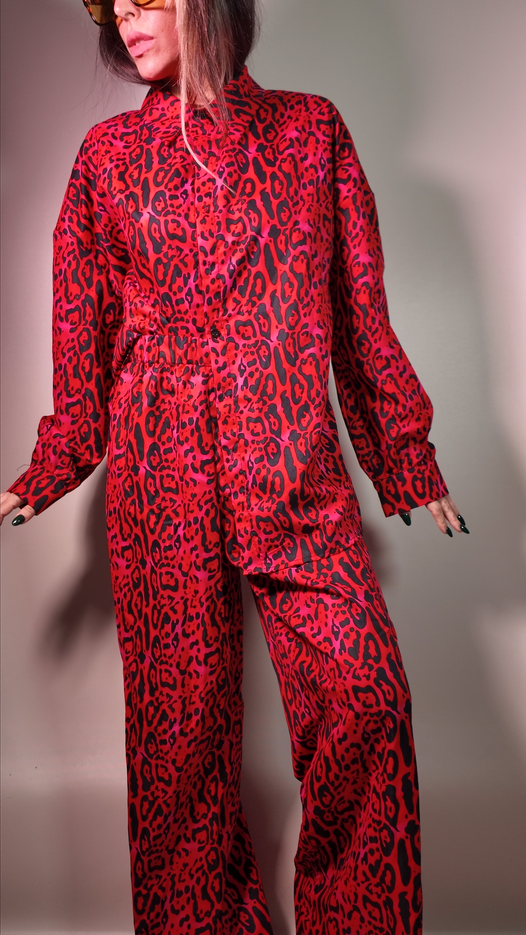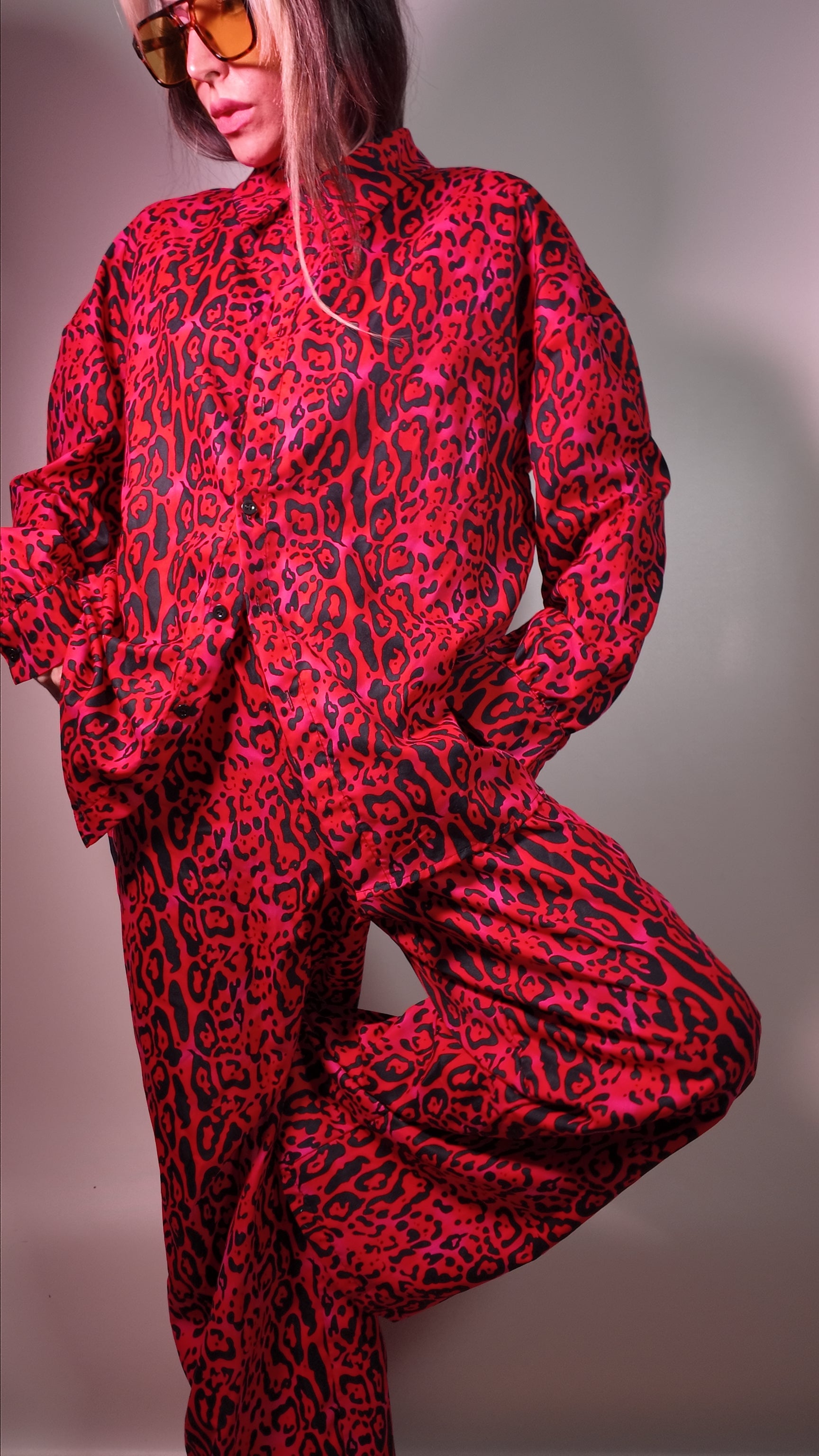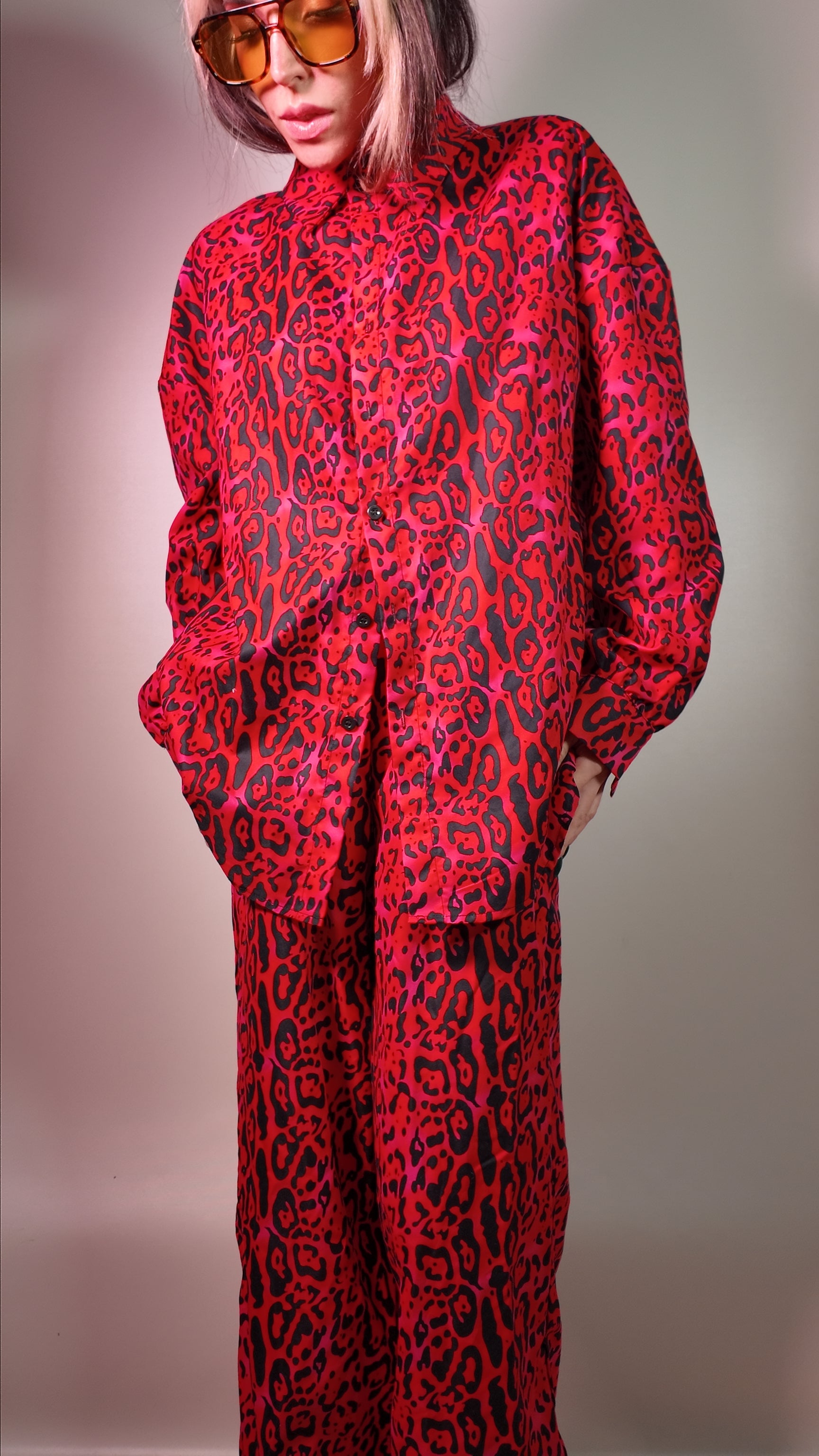 Neon Pink and Black Animal Print Set - Button Down Shirt with Elastic Pants Small/Medium